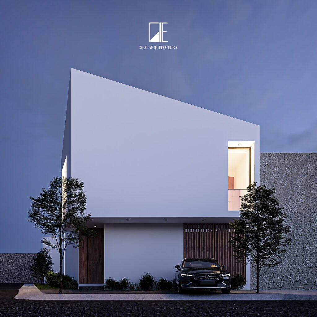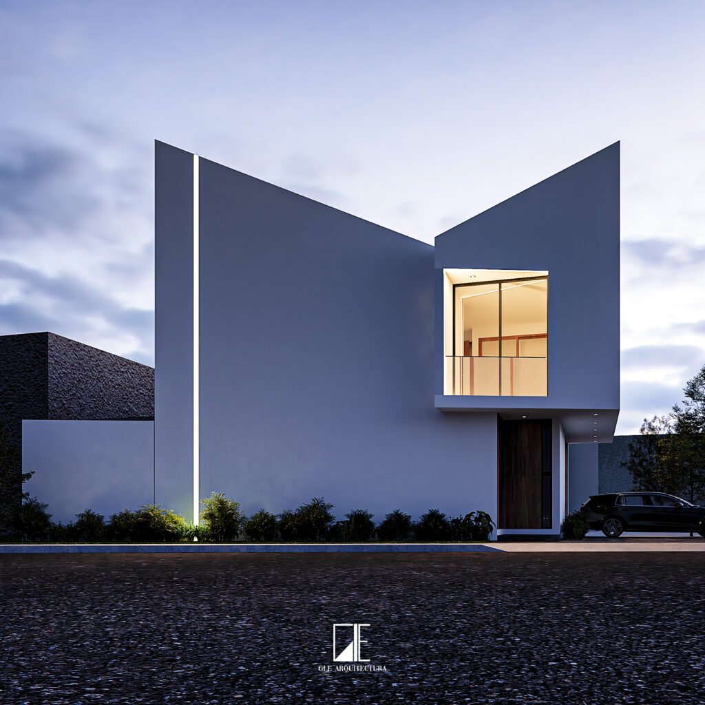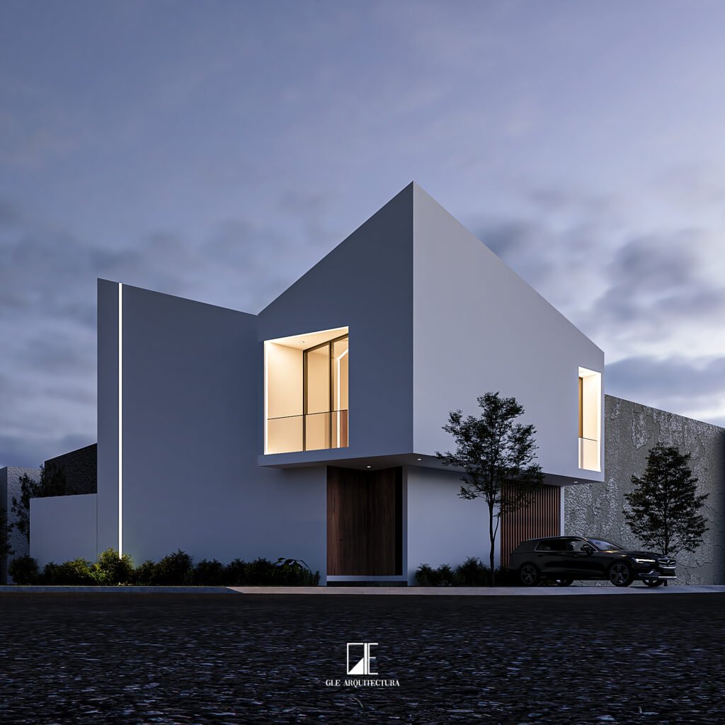 Los volúmenes sólidos, las líneas rectas y los grandes ventanales generan un juego de luz y sombra que resalta especialmente en iluminación nocturna, aportando elegancia y sofisticación. La combinación de materiales sobrios con detalles en madera crea un balance perfecto entre modernidad y calidez, logrando una casa con identidad propia y carácter atemporal.