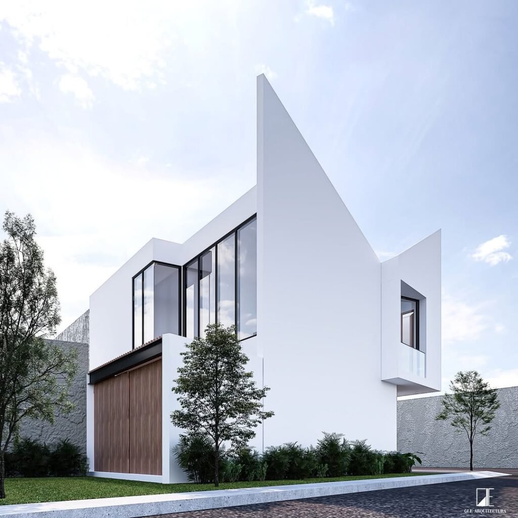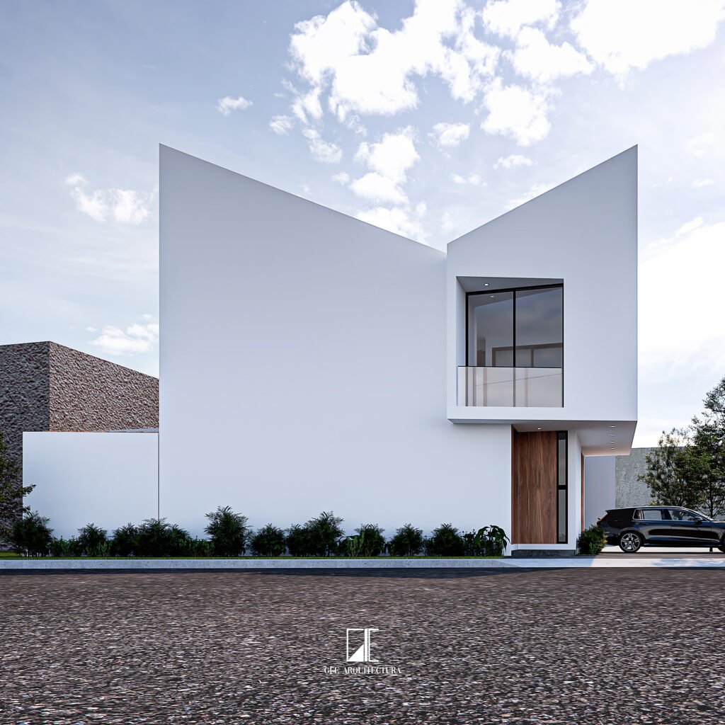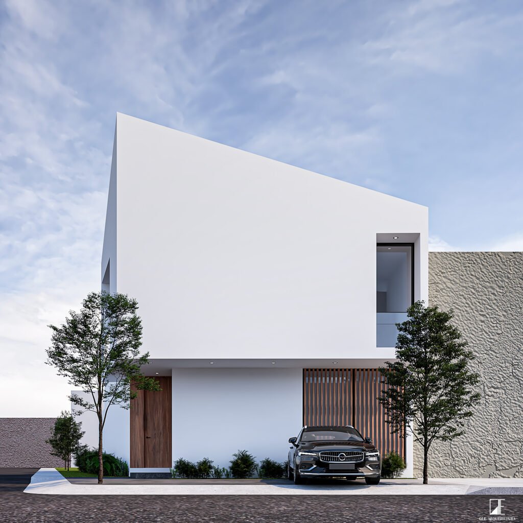 Los volúmenes sólidos, las líneas rectas y los grandes ventanales generan un juego de luz y sombra que resalta especialmente en iluminación nocturna, aportando elegancia y sofisticación. La combinación de materiales sobrios con detalles en madera crea un balance perfecto entre modernidad y calidez, logrando una casa con identidad propia y carácter atemporal.